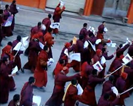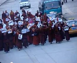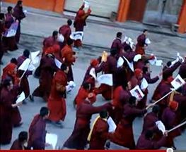 Dutzende Tibeter bei einem Polizeieinsatz mit Sprengstoff und Tränengas verletzt, ein Kind getötetDutzende von unbewaffneten Tibetern wurden am 18. März verletzt, als die chinesischen Sicherheitskräfte Tränengas einsetzten und Handgranaten auf eine Menge friedlicher Demonstranten abfeuerten. „Am 18. März warfen chinesische Sicherheitskräfte Tränengaspatronen in eine Menge protestierender Tibeter im Bezirk Gepa Sumdo (chin. Tongde) in der TAP Tsolho (chin. Hainan), Provinz Qinghai“, teilte ein in Südindien lebender Tibeter mit. „Sieben Schwerverletzte mußten ins Krankenhaus gebracht werden, doch andere Verletzte erhielten keine medizinische Versorgung“. Ein Tibeter aus der Gegend teilte dem Radiosender Voice of Tibet mit, bei dem „unangemessenen und sinnlosen“ Gewalteinsatz sei ein 12jähriges Kind ums Leben gekommen. Nähere Angaben über den Polizeieinsatz und um was für eine Art von Sprengkörpern es sich handelte, waren nicht zu erhalten. Zu dem Einsatz am Sonntag kam es, nachdem die dort ansässigen Tibeter drei Tage lang die Freilassung von 50 Mönchen aus dem Klosters Shingtri in Ba Thunte oder Gepa Sumdo gefordert hatten. Diese waren am 15. März festgenommen worden, weil sie bei ihrem Marsch die verbotene tibetische Nationalflagge hochgehalten und mehr Freiheit in Tibet gefordert hatten. „Die Namen einiger der Festgenommenen sind Yeshe Dorje, Jang Rin, Sherab Palsang und Pema Rigdzin, bei den meisten handelt es sich um junge Mönche des Klosters“. Außerdem seien ein bekannter tibetischer Sänger mit seiner Frau und seinen zwei Söhnen unter dem Verdacht der Beteiligung an dem Protest festgenommen worden. Unabhängig davon habe um den 8. März herum die bewaffnete Polizei ein Dorf in der Gemeinde Dzatoe im Bezirk Derge überfallen und dabei acht Tibeter in Gewahrsam genommen, wie aus einer dortigen Quelle verlautet. „Sie wurden verdächtigt, für die Verteilung von Flugblättern anti-chinesischen Inhalts in der Gegend verantwortlich zu sein“. „Die Sicherheitskräfte, die in 20 Fahrzeugen angefahren kamen, umstellten das Dorf Rebpa, drangen in die Häuser ein und nahmen die Leute einfach mit“. Wegen der zahlreichen Sicherheitskräfte und anderer Spitzel in der Stadt seien noch keine Namen und Details übermittelt worden. Ein anderer Mann namens Khega sei am 16. März in Dzatoe festgenommen worden: „Khega aus der Ortschaft Doda war an den Demonstrationen von 2008 aktiv beteiligt, wie alt er ist, weiß man nicht“. Indessen nahm die Polizei auch in der Präfektur Nagchu der TAR fünf Tibeter unter dem Verdacht der „Planung anti-chinesischer Aktivitäten“ fest, teilte Ngawang Tharpa aus Indien mit. Sie hatten sich am 9. März in einem Restaurant getroffen, um für den 10. März, den 53. Jahrestag des tibetischen Volksaufstandes, eine Protestaktion zu planen. „Sie wollten für Freiheit in Tibet, die Rückkehr des Dalai Lama und die Wiedereröffnung von kürzlich geschlossenen Klöstern demonstrieren, sowie dafür, daß die Mönche ihr Recht auf das Studium und die religiöse Praxis zurückerhalten“. Die chinesische Polizei, die von dem Vorhaben erfahren hatte, nahm am 10. März um etwa 9 Uhr Tharlam, Siga und Dzomlha Kar fest“. „Und am 14. März wurden Drukdrak und Tsegon in Gewahrsam genommen, über ihren Verbleib und ihren Zustand ist nichts bekannt geworden“. Ein neues Video aus Tibet, das auf der Website www.tibet.net veröffentlicht wurde, zeigt den Protestmarsch der Mönche in Gepa Sumdo am 15. März, bei dem sie die Rückkehr des Dalai Lama und die Achtung der tibetischen Sprache forderten: |