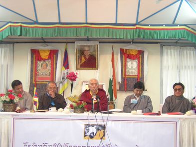 Die Rednertribüne: Der Hauptgast bei der Feier war der Kalon Tripa, der Premierminister der Exilregierung, Prof. Samdhong Rinpoche, links von ihm (rechts vom Betrachter) der Oberste Richter der Tibetischen Justiz-Kommission, noch weiter links der Präsident des Exilparlaments, zu seiner Rechten der frühere Oberste Richter und der Vorsitzende des Verwaltungsrats des TCHRD, noch weiter rechts der jetzige Direktor des TCHRD.