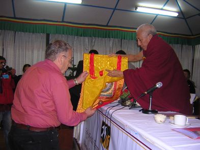 Prof. Samdhong Rinpoche überreicht Herrn Johannes Haufschild aus Hannover eine Thangka als Auszeichnung für unsere Arbeit für Tibet.