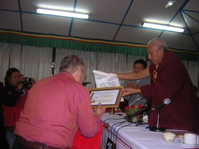 Prof. Samdhong Rinpoche überreicht Herrn Johannes Haufschild (als unserem Vertreter) eine Urkunde in Anerkennung unserer langjährigen Übersetzungsarbeit und Verbreitung der Nachrichten aus Tibet unter dem deutschsprachigen Publikum.