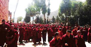 „Da traten Angehörige des Klosterverwaltungsrates heraus und baten die Mönche, von ihrem Vorhaben Abstand zu nehmen. So setzten die Mönche sich vor dem Tor der buddhistischen Dialektik-Schule auf den Boden und begannen dort zu beten. Und es wurden immer mehr Mönche“.