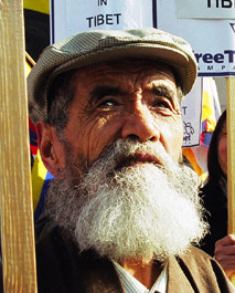 Der über siebzig Jahre alte ehemalige politische Gefangene Takna Jigme Sangpo verbüßte die längste Haftstrafe von allen Gewissensgefangenen in Tibet. Nach seiner aus Gesundheitsgründen erfolgten Entlassung aus der Haft sprach er vor verschiedenen Foren über Tibet und die Menschenrechte in China. Siebenunddreißig Jahre hinter Gittern konnten den Geist des bärtigen alten Mannes nicht brechen. Körperlich gebrechlich, doch geistig voller Kraft sprach er nach seiner Ankunft in Dharamsala am 16. März mit Pressevertretern. Hier folgen einige Auszüge aus dem Interview: Photo von FTC: Takna Jigme Sangpo am 7. März 2004 bei einer Demonstration in London, siehe www.freetibet.org |