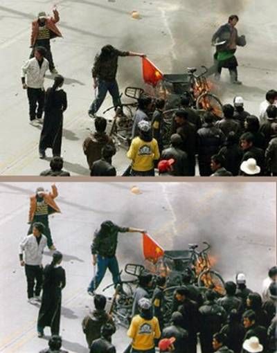 Nach Aussage des Chinesischübersetzers des Dalai Lama, Ngawang Nyendra, erzählte eine Augenzeugin, daß ein chinesischer Polizist in Lhasa sich als Tibeter verkleidet und mit einem Messer in der Hand unter die Protestierenden gemischt habe. Dieselbe Zeugin erkannte den Mann in einer Sendung von BBC und auf dem von den Chinesen zur Verfügung gestellten Filmmaterial wieder. (Es handelt sich um das Reuters-Foto mit Titel „A protester burns a Chinese flag, over burning bicycles, Lhasa 14 March: http://www.phayul.com/news/article.aspx?id=19644&t=3&c=1 Die Zeugin, eine Chinesin aus Thailand, die anonym bleiben möchte, weilte als Studentin in Lhasa, als die Proteste ausbrachen. Sie pflegte häufig einen ihrer Freunde, einen Polizisten, in der örtlichen Polizeistation zu besuchen, wo sie auch mit anderen Polizisten bekannt wurde. Auf die Unruhen vom 14. März hin wurde sie zusammen mit anderen Ausländern in die örtliche Polizeistation gebracht. Dort sah sie, wie einige bei den Protesten verhaftete Tibeter hereingeführt wurden. Unter ihnen habe sich auch ein Mann mit einem Messer in der Hand befunden, der später seine Kleidung im tibetischen Stil ablegte und wieder seine Polizeiuniform anzog. Am folgenden Tag mußte diese Chinesin zusammen mit anderen Ausländern das Land verlassen. Als sie in Indien die BBC-Fernsehnachrichten sah, erkannte sie den Polizisten, den sie in Lhasa in tibetischer Kleidung gesehen hatte, wieder, ebenso auf dem von der chinesischen Botschaft an die Medien gelieferten Fotomaterial, auf dem unter den Protestierenden ein mit einem Messer bewaffneter vermeintlicher Tibeter gezeigt wird. Ngawang Nyendra sagte, die Chinesin sei über den Anblick des Polizisten in den BBC-Nachrichten schockiert gewesen, denn sie habe erst jetzt richtig begriffen, daß dieser Mann sich als ein Tibeter verkleidet hatte, um andere Menschen zu Gewaltakten zu animieren. Die Zeugin trat sogleich mit einer tibetischen Exilorganisation in Indien in Kontakt und berichtete dort, was sie gesehen hatte. Bei einer Kundgebung am 17. März 2008 zeigte die Organisation ein Foto, das von der chinesischen Botschaft in Indien verbreitet wurde und auf dem der Polizist als ein tibetischer Randalierer erscheint. Bei Xinhua und auf anderen chinesischsprachigen und regimetreuen Websites war der verkleidete Polizist nach der Kundgebung, auf der die Zeugin über ihre Beobachtungen gesprochen hatte, plötzlich aus dem Foto verschwunden. Aber bald danach tauchte das ursprüngliche Bild mit dem Mann und dem Messer wieder auf. Ngawang Nyendra erklärte: "Dieses Foto, auf dem der Mann mit dem Messer erscheint, wurde von der chinesischen Botschaft an BBC und Radio Free Asia gegeben. Das retuschierte Foto wurde erst später ausgesandt. Die Fotos sind völlig identisch, nur daß auf dem zweiten der Mann mit dem Messer verschwunden ist. Auf dem Film der Fernsehnachrichten kann man erkennen, wie der Mann mit dem Messer auf andere Leute losgeht. Doch in späteren Aufnahmen ist er nicht mehr zu sehen. Das war alles nur gestellt. Nachdem Fragen über dieses Bildmaterial laut wurden, erschien es nie mehr im Fernsehen." Weitere BeweiseDie wichtigste Aussage der dramatischen Geschichte des Übersetzers des Dalai Lama, daß nämlich das chinesische Regime die Unruhen in Lhasa angefacht hat, wird nun auch durch andere Quellen erhärtet. Zunächst einmal ist zu erwähnen, daß das chinesische Regime für derartige Täuschungsmanöver berüchtigt ist. Dies war nicht das erste Mal, daß die kommunistische Partei Chinas verkleidete Polizisten als Randalierer zu friedlichen Protesten der Tibeter schickte, um die Gemüter aufzupeitschen und am Ende die Demonstranten der Gewalt bezichtigen zu können. In seinem Artikel "Events in Lhasa, March 2-10, 1989", den wir an früherer Stelle veröffentlichten, erläuterte der chinesische Journalist Tang Daxian, wie die kommunistische Partei Chinas mit Vorbedacht Gewalttaten inszenierte, um dann die Proteste im Jahre 1989 um so heftiger niederschlagen zu können. In dem Artikel heißt es: "Am frühen Morgen des 5. März erging ein Befehl des Kommandeurs der Bewaffneten Volkspolizei Li Lianxiu: Die Spezialeinheiten müssen sofort 300 Mann abstellen, die sich als normale Tibeter oder Mönche zu verkleiden haben. Sie sollen sich dann zur Eight-Corner-Street und anderen Unruheherden in Lhasa begeben, um dort Polizisten in Zivil bei ihrer Arbeit zu unterstützen. ‚Verbrennt die Schriftenpagode nordöstlich vom Dazhao-Tempel. Zerstört den Reisladen im Geschäftsviertel, hetzt die Leute auf, Reis und andere Nahrungsmittel zu stehlen und greift die Tibet-Gansu-Handelsgesellschaft an. Hetzt die Leute zum Plündern auf, aber nur an den genehmigten Plätzen’." Der Kommentator Chen Pokong schrieb: "Die Szenerie der diesjährigen Proteste ähnelte sehr stark der von 1989. Eine Gruppe von jungen Männern zwischen 20 und 30 Jahren agierte in gut organisierter Weise. Zuerst riefen sie Parolen, dann zündeten sie in der Nähe des Klosters Ramoche ein paar Autos an, plünderten dann in die umliegenden Läden und setzten schließlich etliche davon in Brand. Das wirkte alles wohl geplant und gut koordiniert. Die Aktionen wurden sehr professionell durchgeführt. An der Kreuzung beim Kloster Ramoche waren im voraus Steine von ähnlicher Größe und ca. acht kg Gewicht deponiert worden. Seltsamerweise entgingen diese Steine der Aufmerksamkeit der zahlreichen Polizisten und Agenten in Zivil, die doch überall in der Stadt präsent waren." Chens Schilderung von dem, was dieses Jahr geschah, wird von dem britischen High-Tech-Geheimdienst GCHQ bestätigt, dessen Satelliten angeblich beobachteten, wie chinesische Polizisten die Unruhen in Lhasa anfachten, heißt es in einem Bericht des G2-Bulletin. Derartige Berichte werfen Licht auf einen etwas verwirrenden Bericht der New York Times über die Szenen in den Straßen von Lhasa am 14. März. Die NY Times schrieb: "Ausländer und Einwohner der Stadt, die Zeugen der G