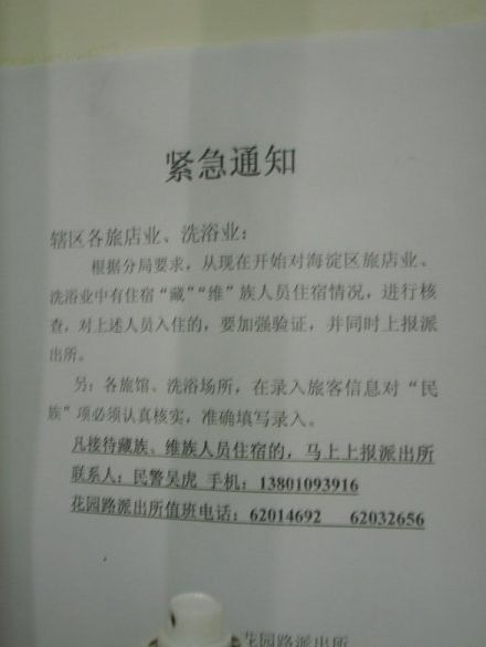 Entsprechend der Anordnung der Zweigstelle des Büros für Öffentliche Sicherheit (PSB) werden alle Gästehäuser und öffentlichen Badehäuser, die sich im Zuständigkeitsbereich von Haidian befinden, aufgefordert, Kontrollen bei Tibetern und Uighuren vorzunehmen, die sich auf ihrem Gelände aufhalten. Alle Personen müssen sich ausweisen können und ihre Anwesenheit ist der örtlichen Polizeistation zu melden.