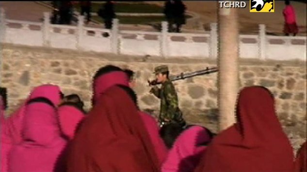 Am 12. März begannen nachmittags zwischen drei und fünf Uhr einhundert Mönche Protestparolen zu rufen. Am folgenden Tag wiederholten sie es, doch am 14. März warnte die Klosterleitung sie: Wenn sie den Protest nicht sofort einstellten, würden chinesische Truppen das Kloster stürmen und ihre Zimmer nach belastendem Material durchsuchen, nach Gegenständen, die zu ihrer Verhaftung führen könnten, wie Bildern Seiner Heiligkeit des Dalai Lama. Daraufhin riefen die Mönche keine Parolen mehr. Aber die Truppen zogen nicht von dem Klostergelände ab. Die Mönche standen einen Monat lang praktisch unter Hausarrest, jeglicher Kontakt mit der Außenwelt war ihnen untersagt. Etliche erkrankten und mußten sich irgendwie selbst helfen.