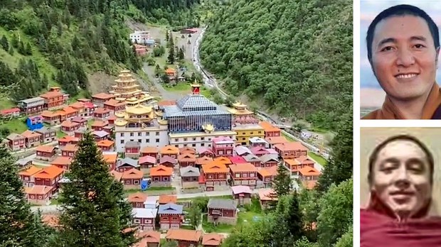 Links ist ein Bild des Klosters Nenang zu sehen, rechts die verhafteten Mönche Tenzin Norbu und Wangchen Nyima |