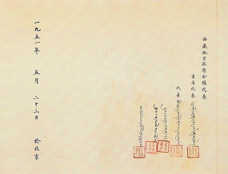 China beauftragte die Tibeter, Vertreter nach Peking zu schicken, wo ein Abkommen unterzeichnet werden sollte, das Tibet rechtskräftig seiner Unabhängigkeit beraubte und es in die Volksrepublik China eingliederte. Gleichzeitig verpflichtete sich Peking in dem Abkommen, Tibet „regionale nationale Autonomie“ zu gewähren, den Dalai Lama und die tibetische Regierung in ihren Ämtern zu belassen und die Religion und Kultur Tibets zu respektieren.